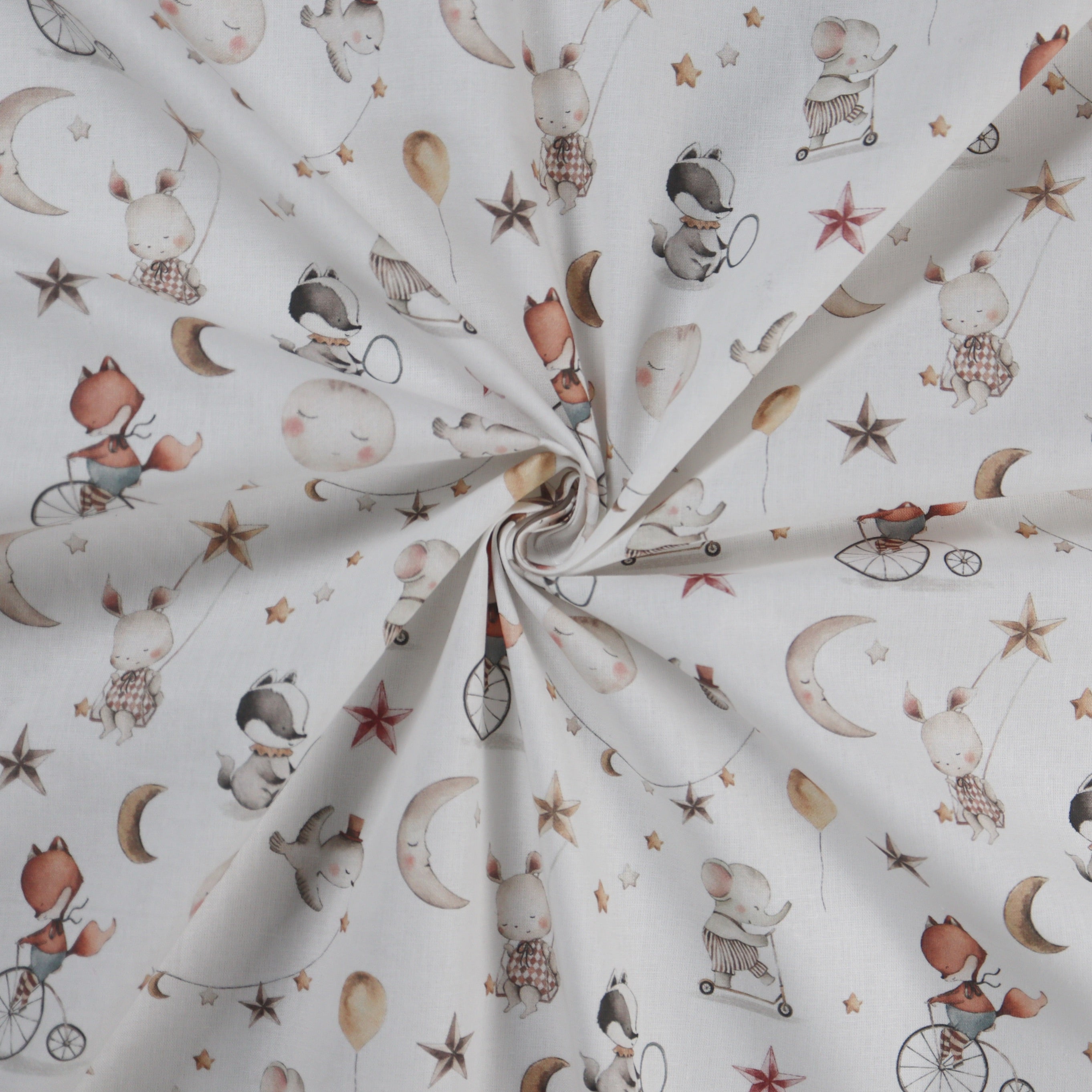 This adorable print features animals playing amongst stars, moons, and bicycles all printed in soft, vintage, colours. This would be perfect for modern nursery decor.
