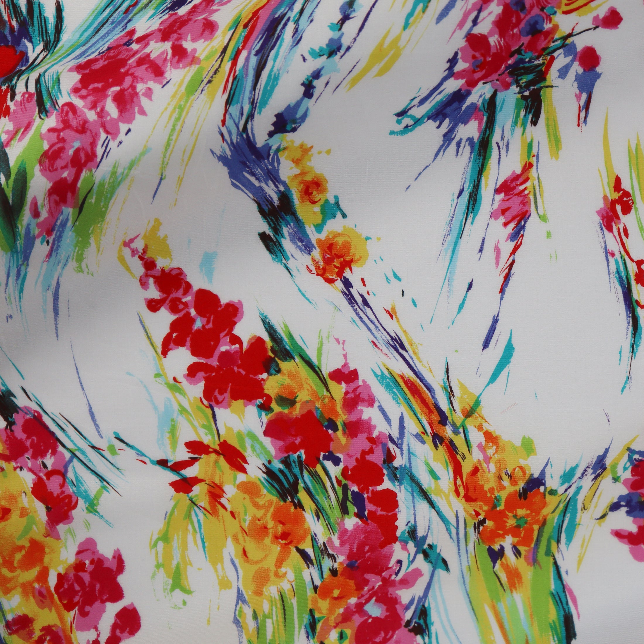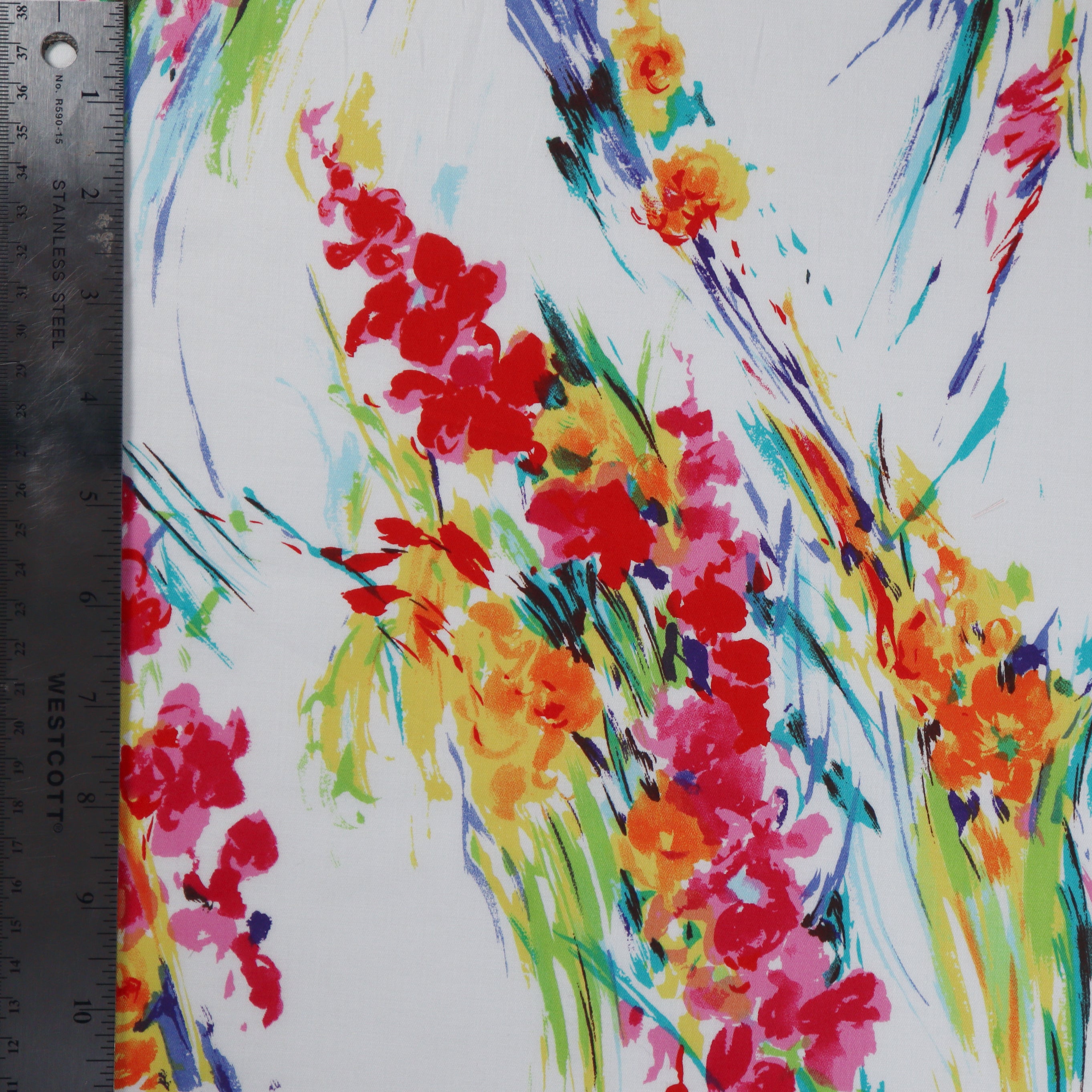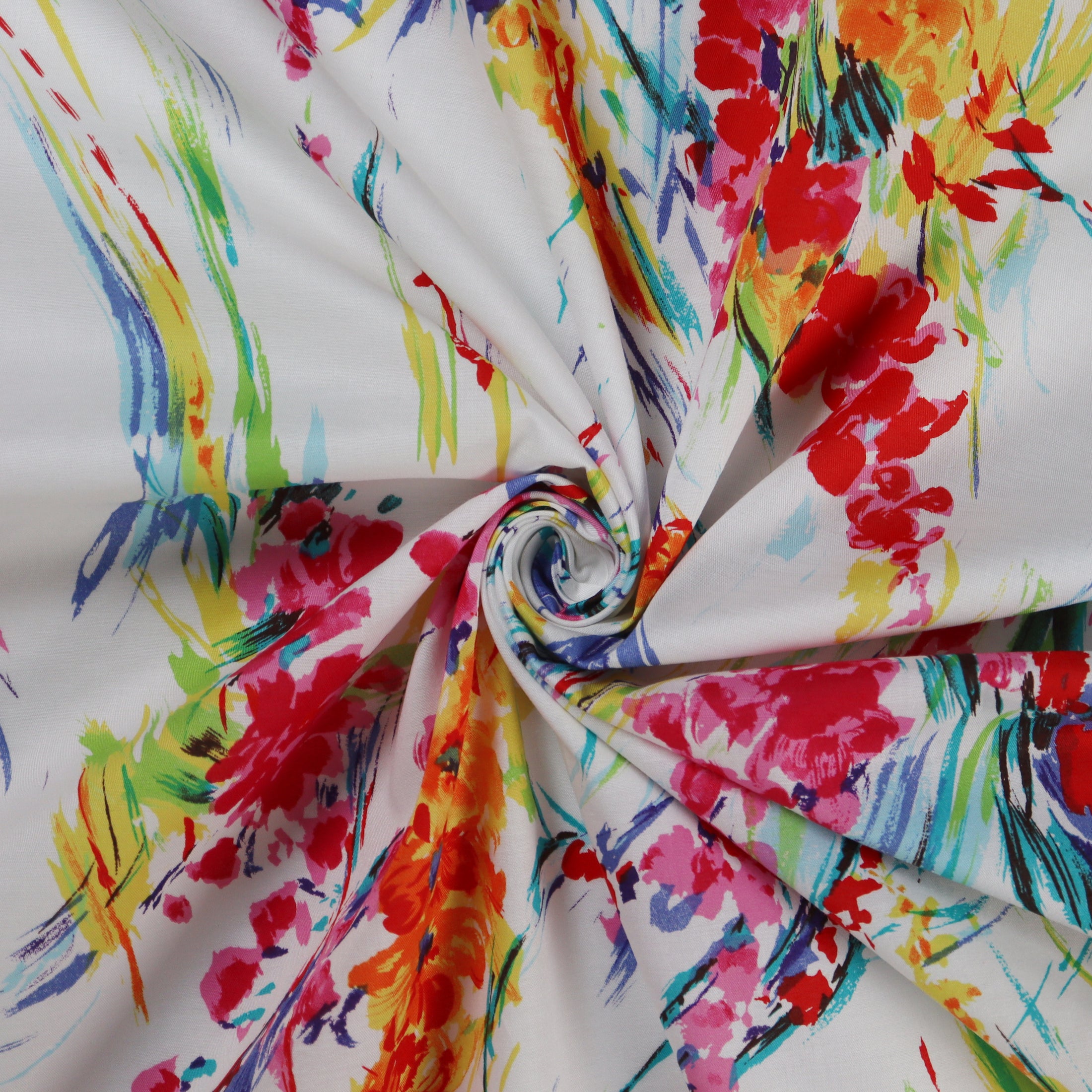 The colours in this dynamic floral are bold and beautiful. The white background makes this fabric a perfect candidate for a summer sundress.