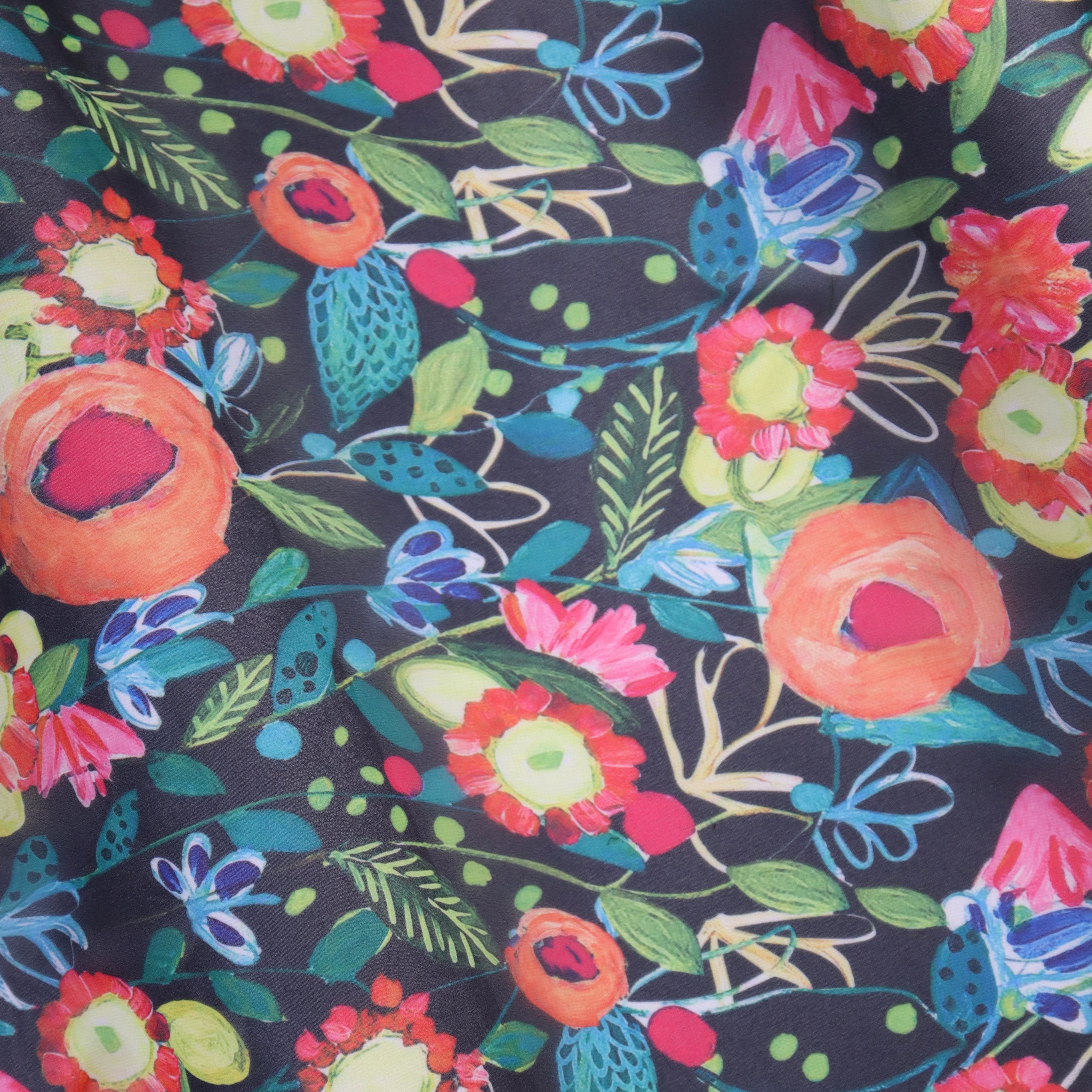 There is a certain modernity to this print. With a deep background, the brightly coloured flowers and foliage come to the fore.