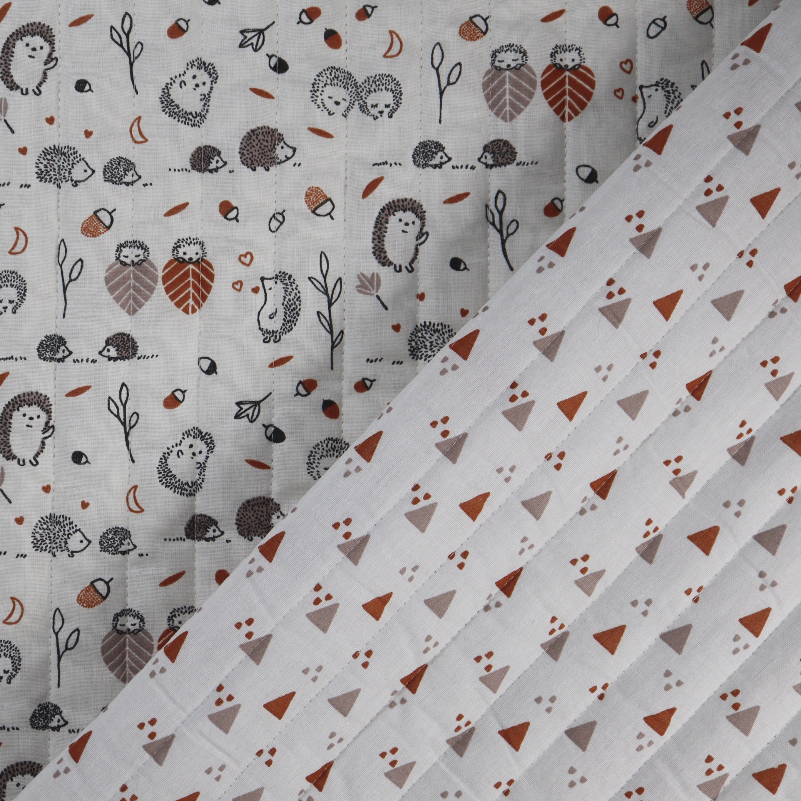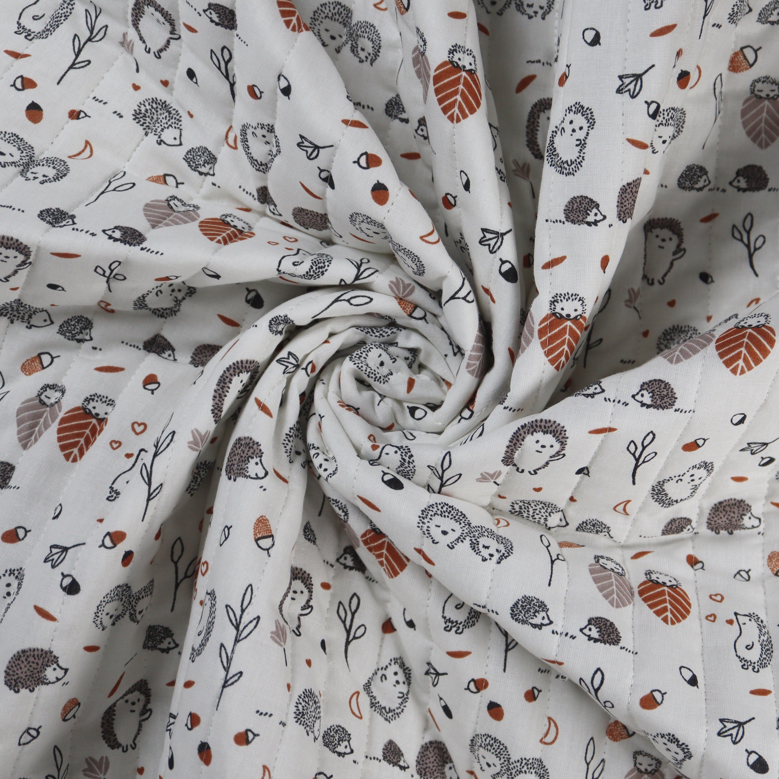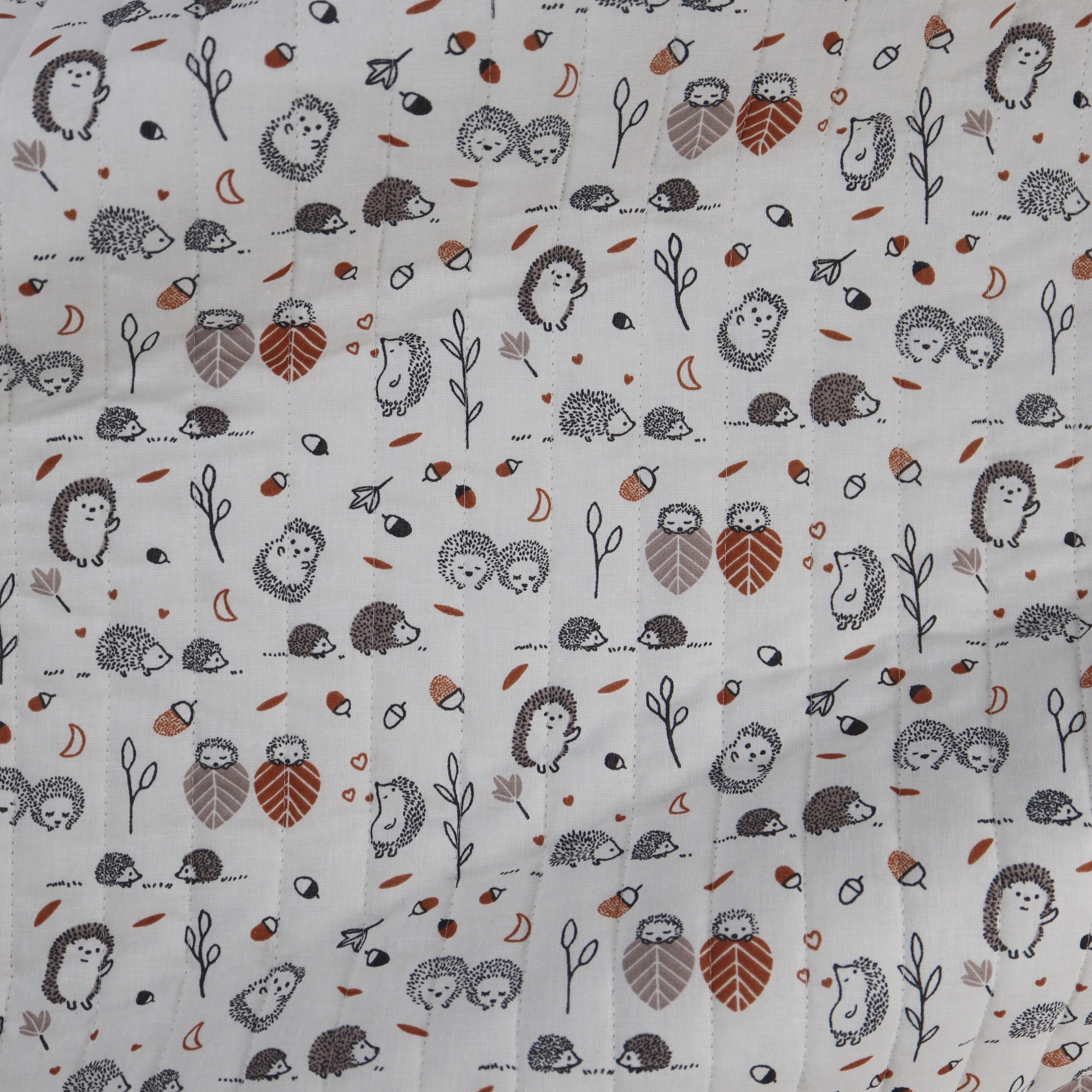 Adorable hedgehogs play among the acorns and leaves on this practical quilted fabric.