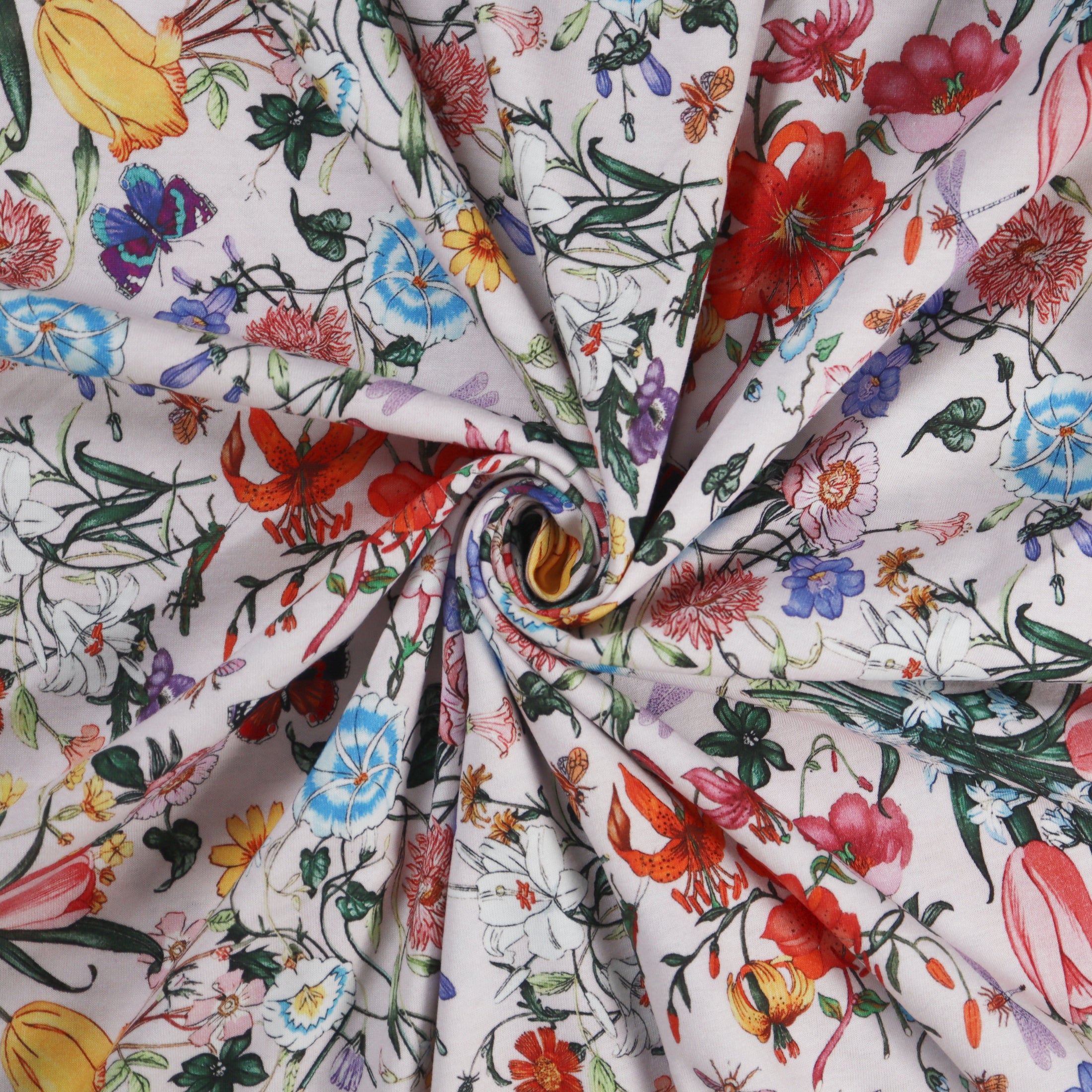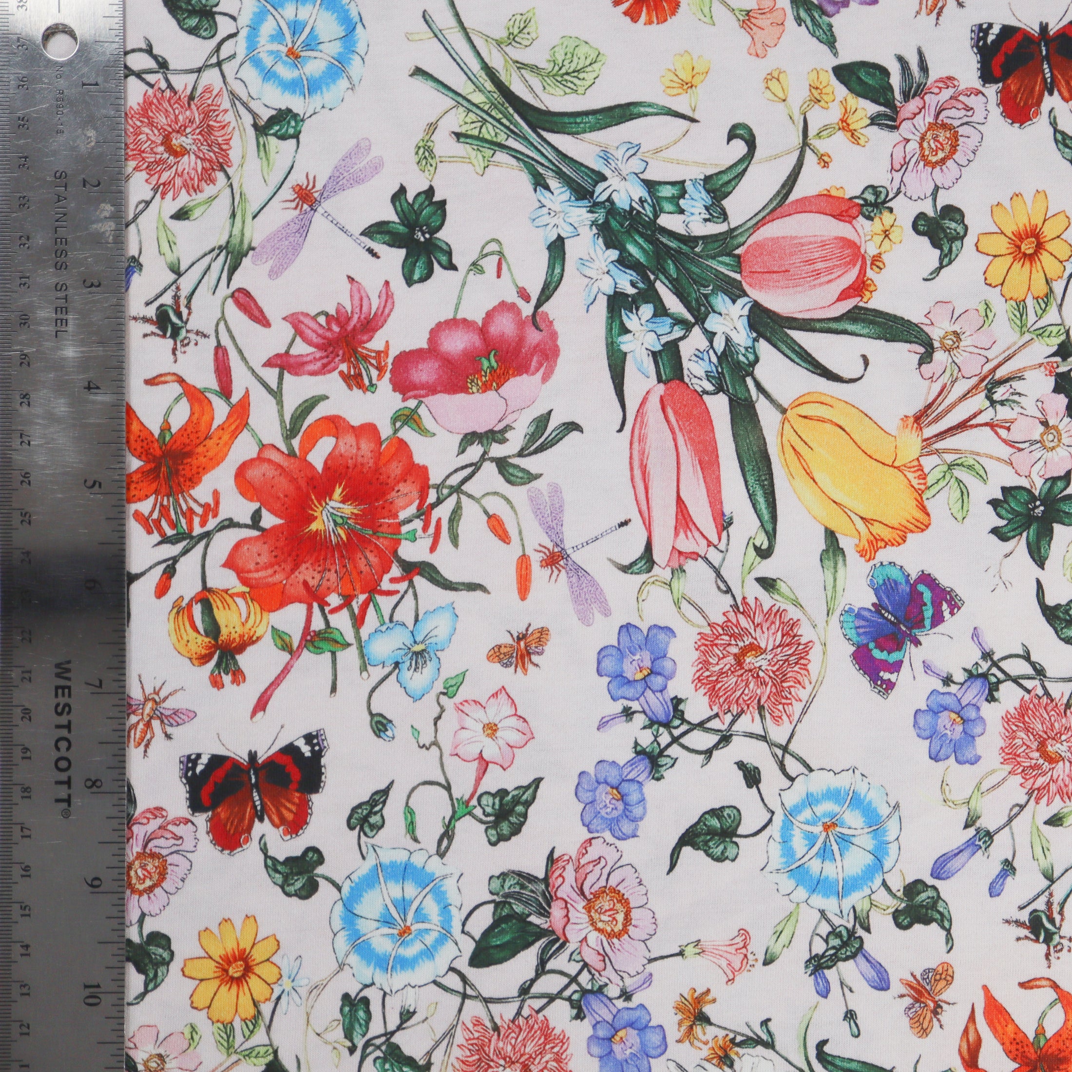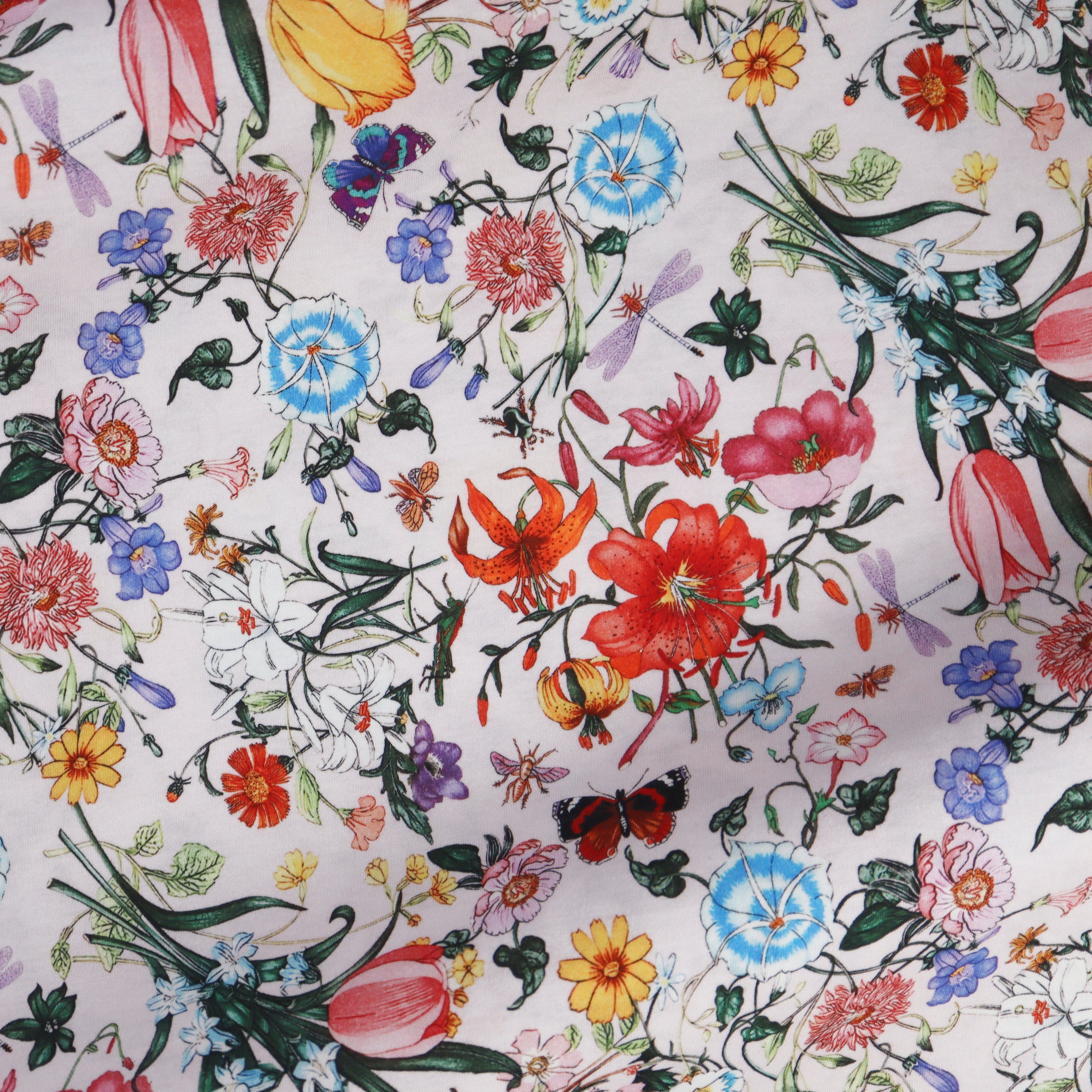 Tulips and Tiger Lilies are among the stars of the garden on this gorgeous printed cotton jersey. This high quality knit fabric would make an elegant and comfortable top for the warm spring and summer seasons.